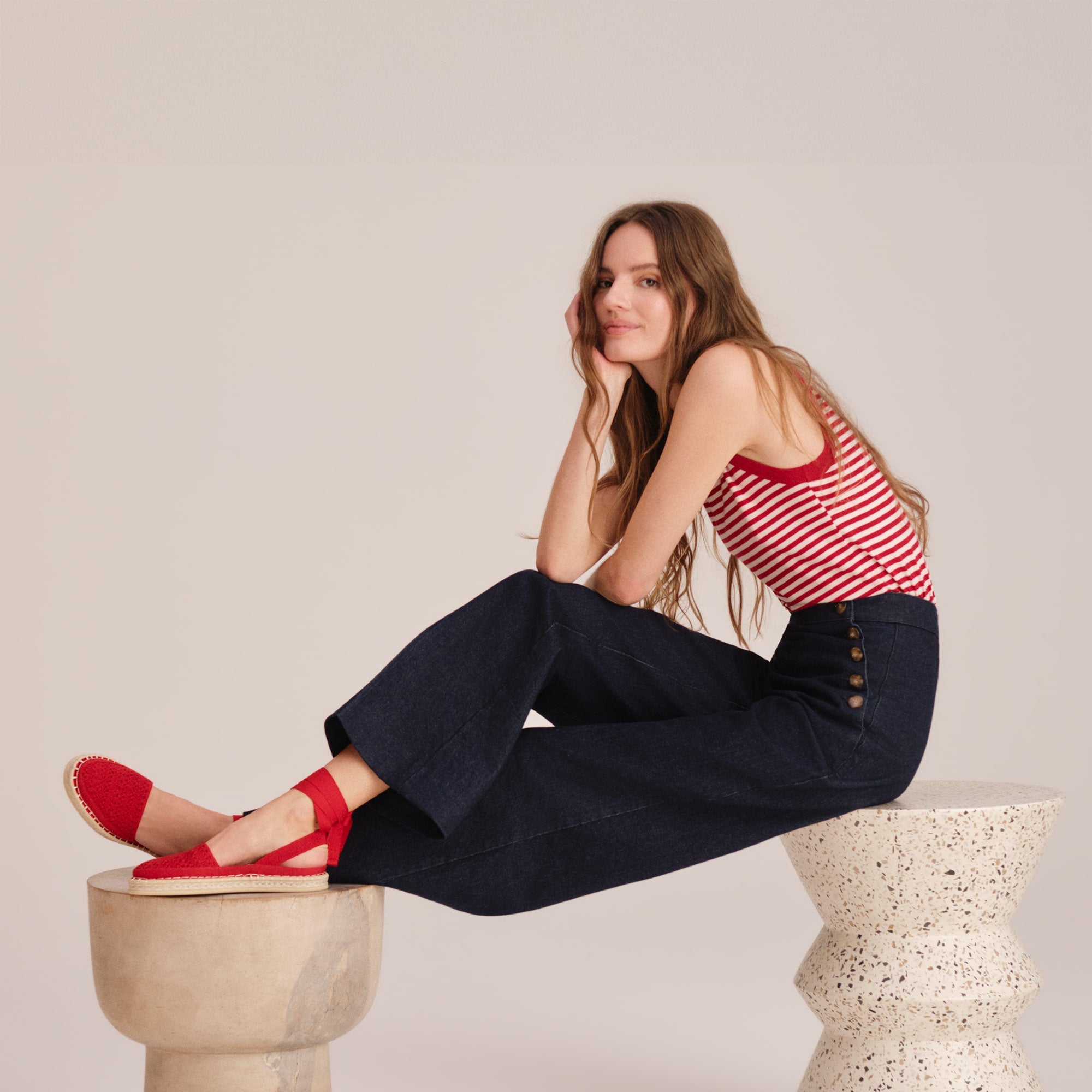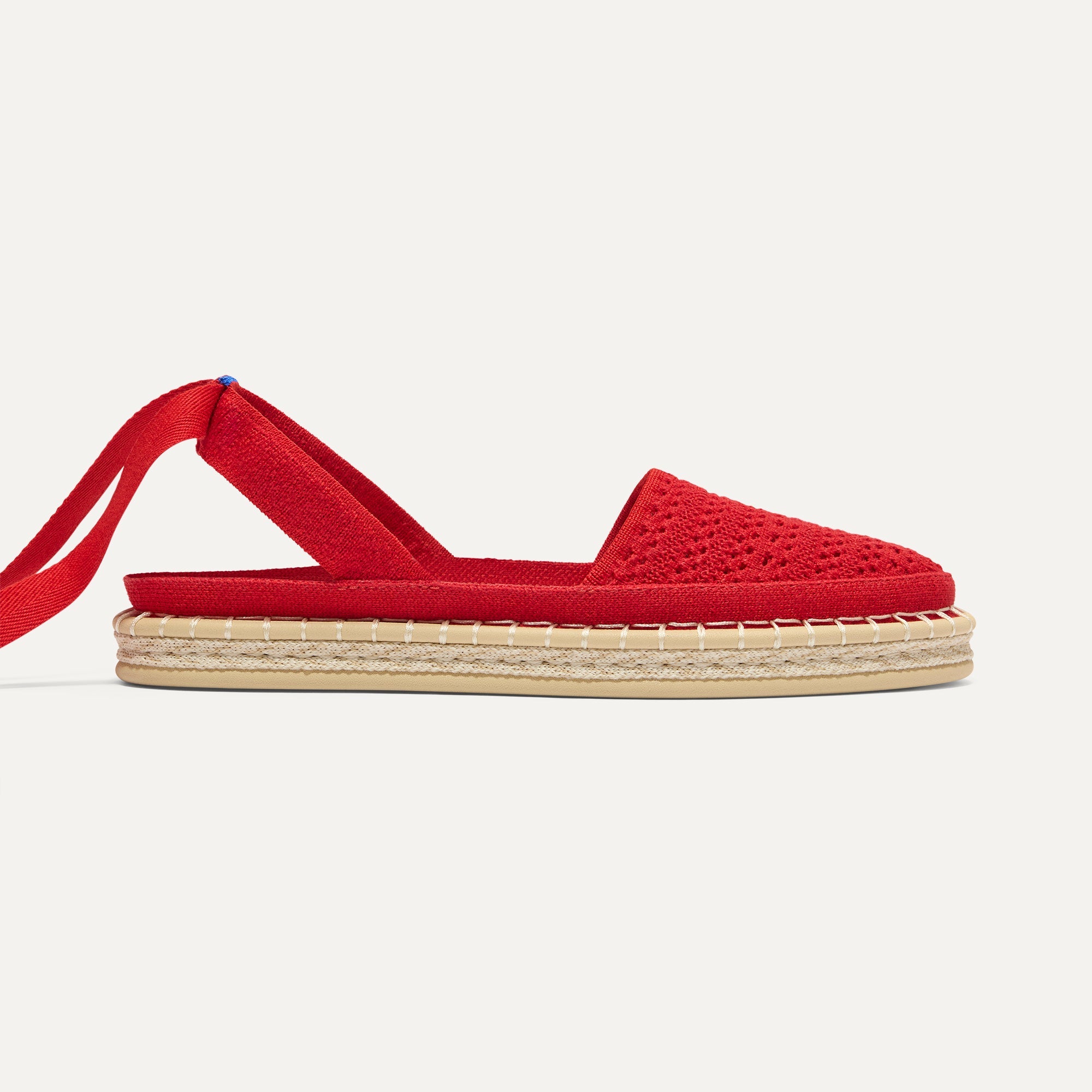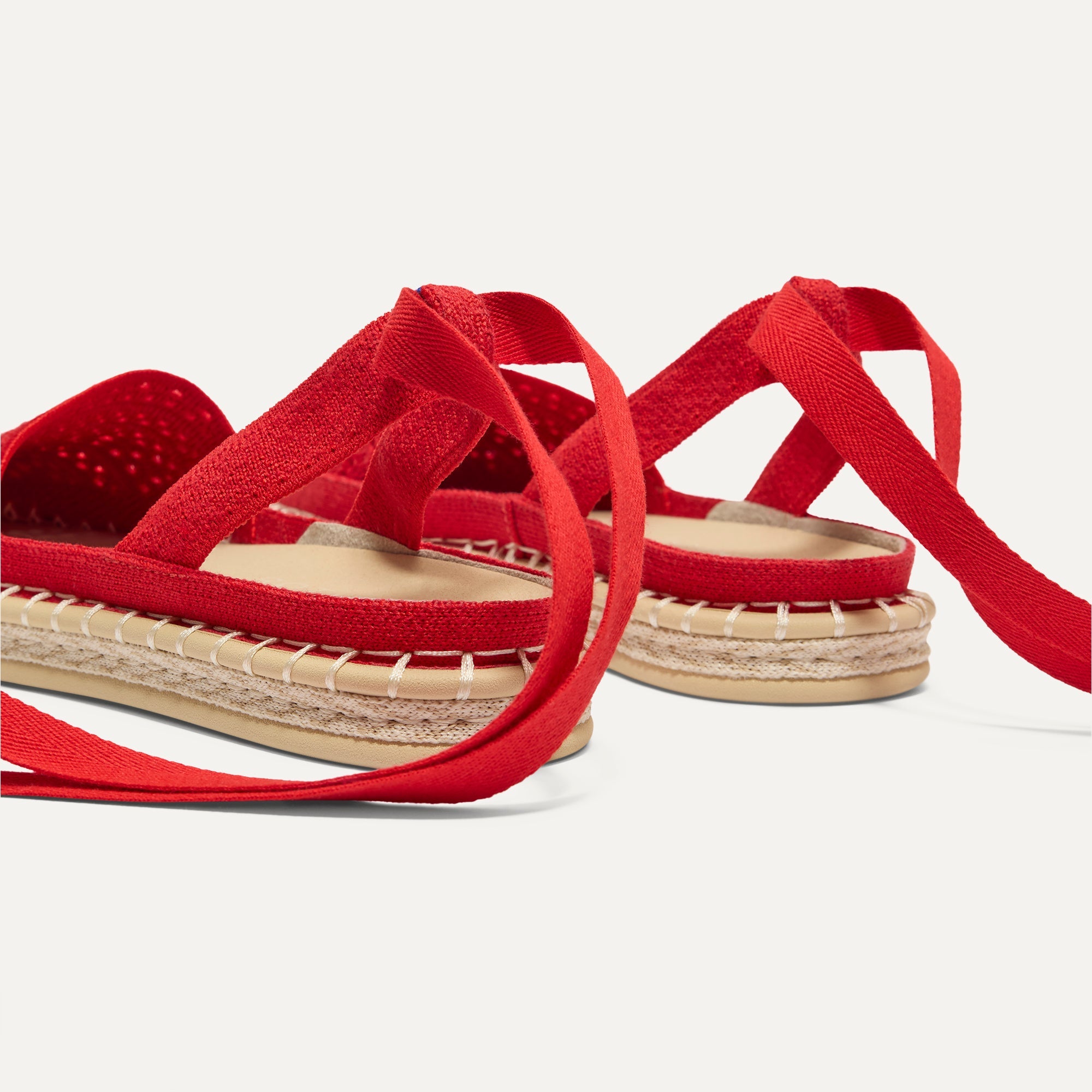 Classic espadrille look with removable bright red tie-up ankle straps.