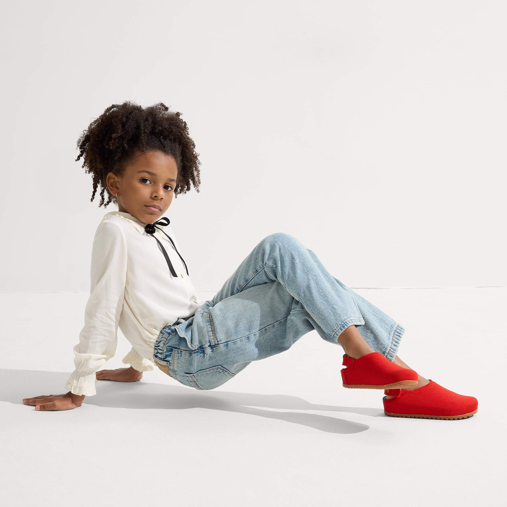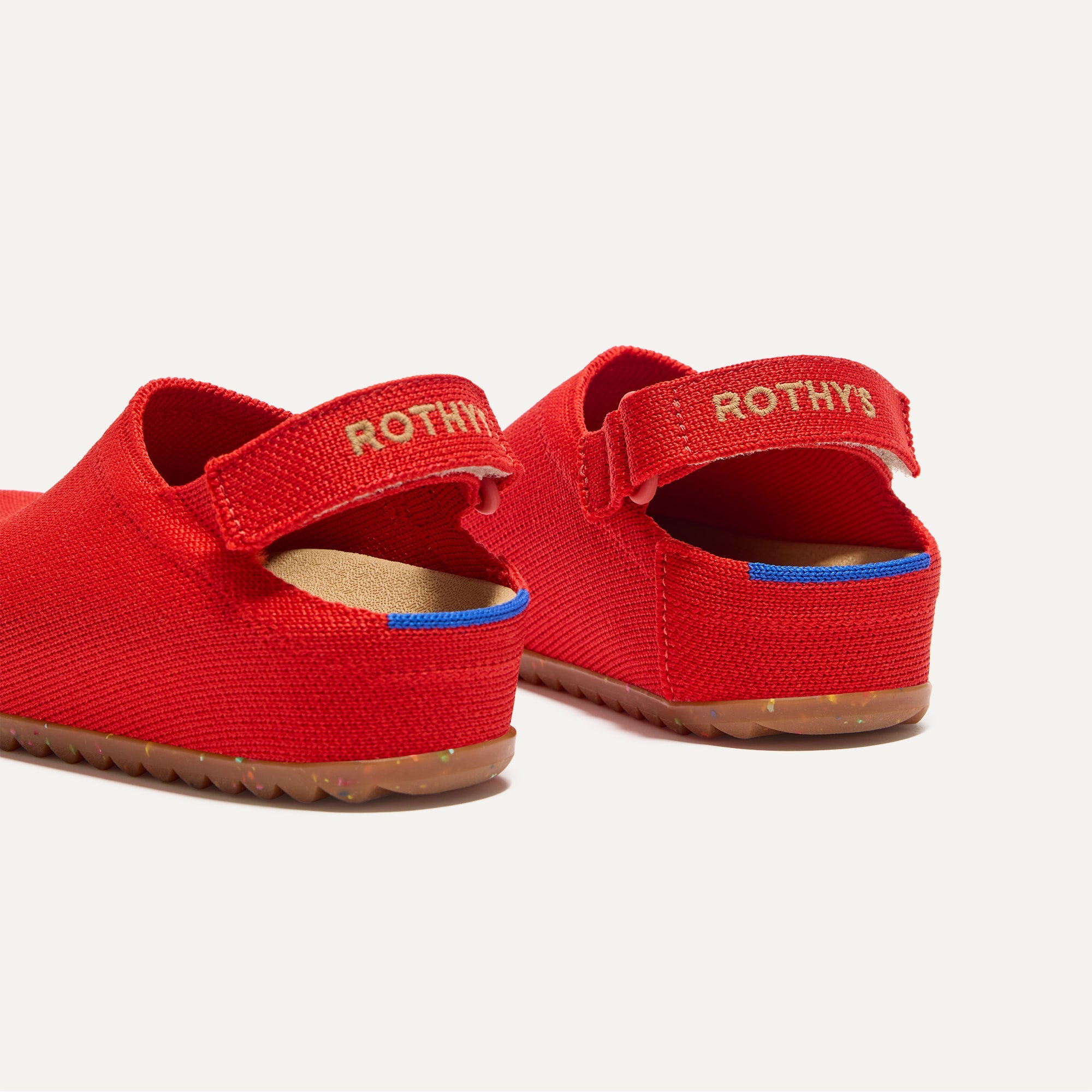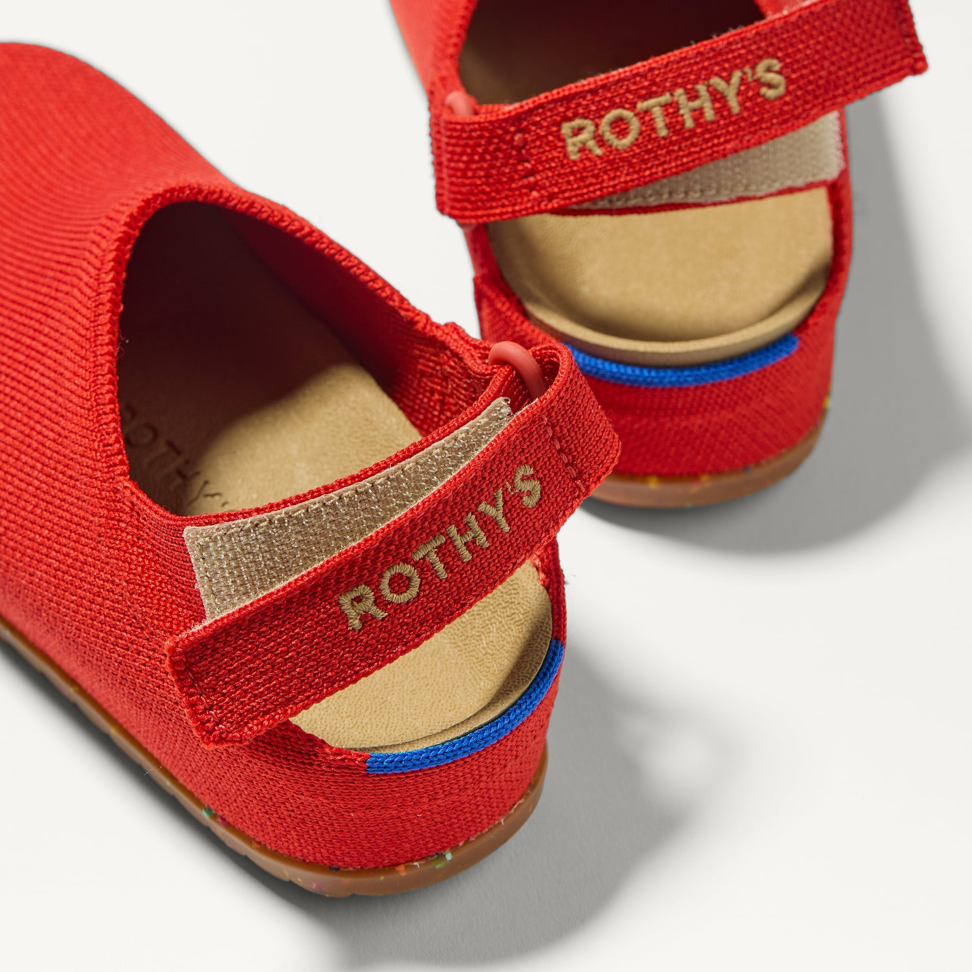 Features a comfortable, adjustable hook & loop heelstrap in bright red to keep their little feet secure.