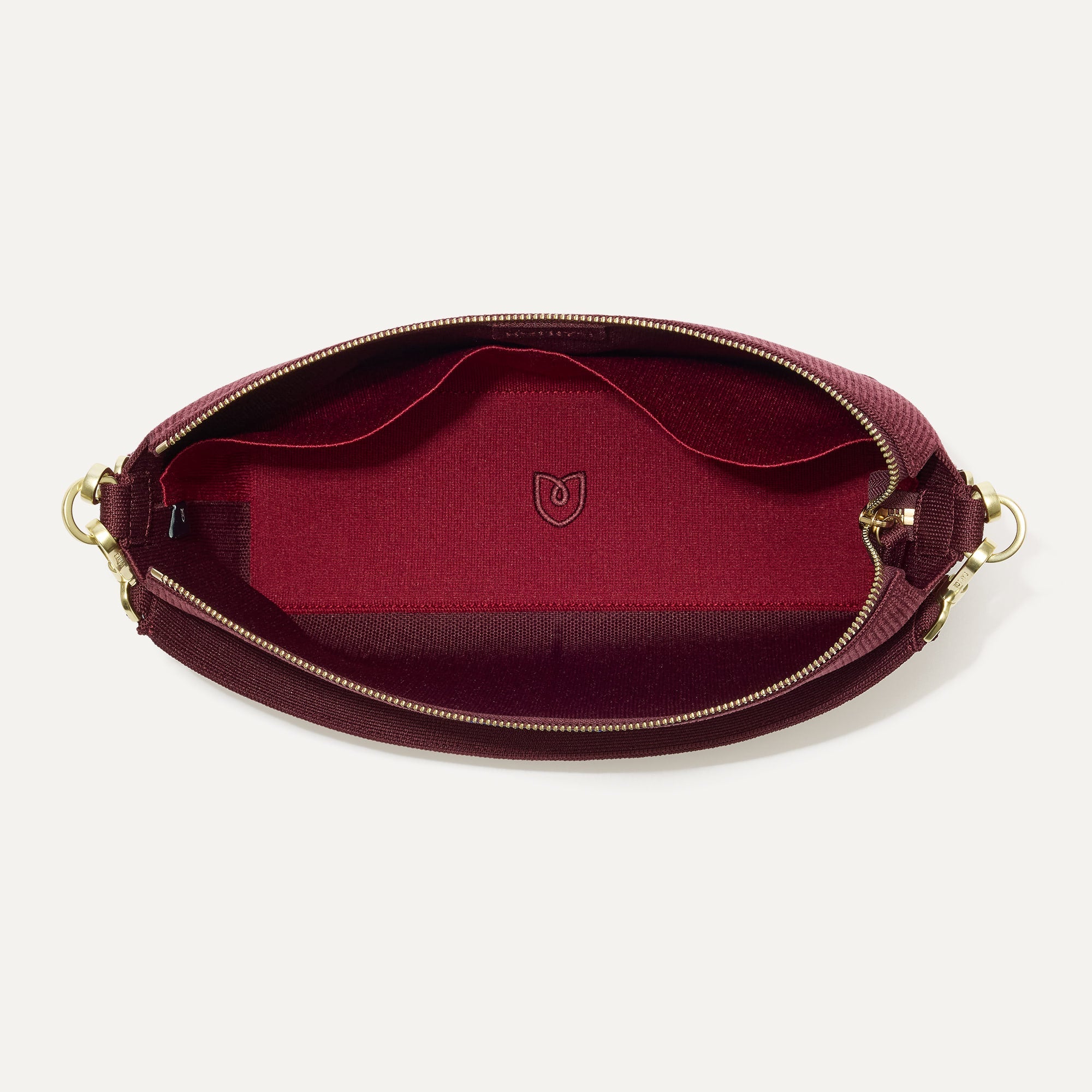 Detachable, adjustable crossbody strap in deep burgundy lets you wear it multiple ways.